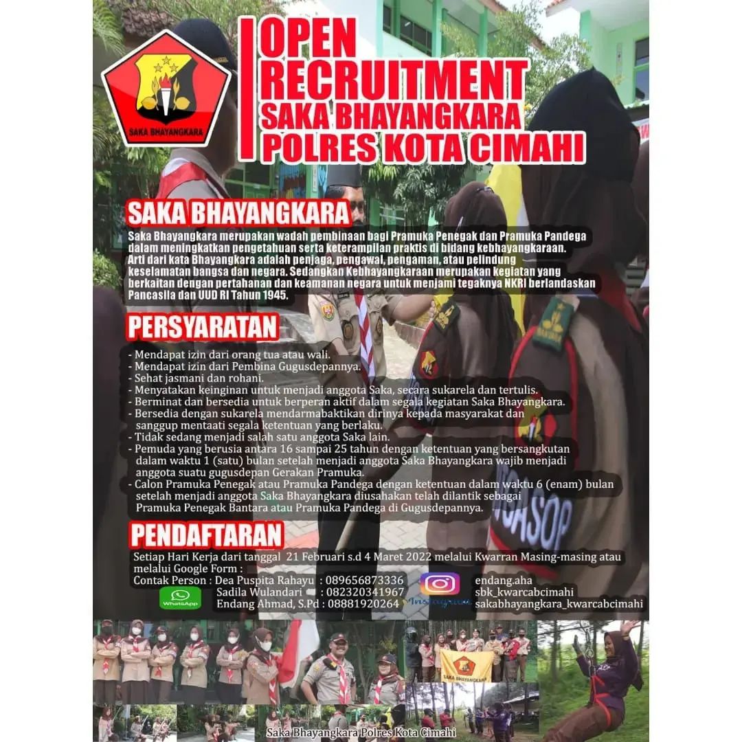 Assalamu’alaikum wr wbSalam Pramuka!Salam Prasbhara!Hallo Kakak-kakak penegak dan pandega se-kota Cimahi dan kabupaten Bandung baratBagaimana kabarnya nih?Semoga selalu dalam keadaan yang sehat dan prima yah.Siapa yang belum tau Saka Bhayangkara nih?Untuk singkat nya Saka Bhayangkara adalah suatu wadah pembinaan untuk pramuka penegak dan pandega dalam meningkatkan pengetahuan serta keterampilan praktis di bidang kebhayangkaraan sekaligus bisa menyalurkan minat bakat kakak-kakakKegiatan Open Recruitment ini akan berlangsung selama periode : : 21 Februari – 4 Maret 2022save the dateUntuk Kakak-kakak yang berminat dapat mengakses gform dibawah ini :https://bit.ly/RecruitmentSakaBhayangkaraPOLRESCIMAHI_A22Yu langsung gabung aja tunggu apa lagiSemangat, dan jaga selalu kesehatan 🏻Salam Pramuka!Salam Prasbhara!wassalamu’alaikum wr wb.Cp :Ka Sadila 082320341967Ka Dea 089656873336